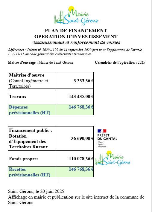 Les plans de financement des opérations d'investissement de la commune concernant l'assainissement te le renforcement de la voirie communale