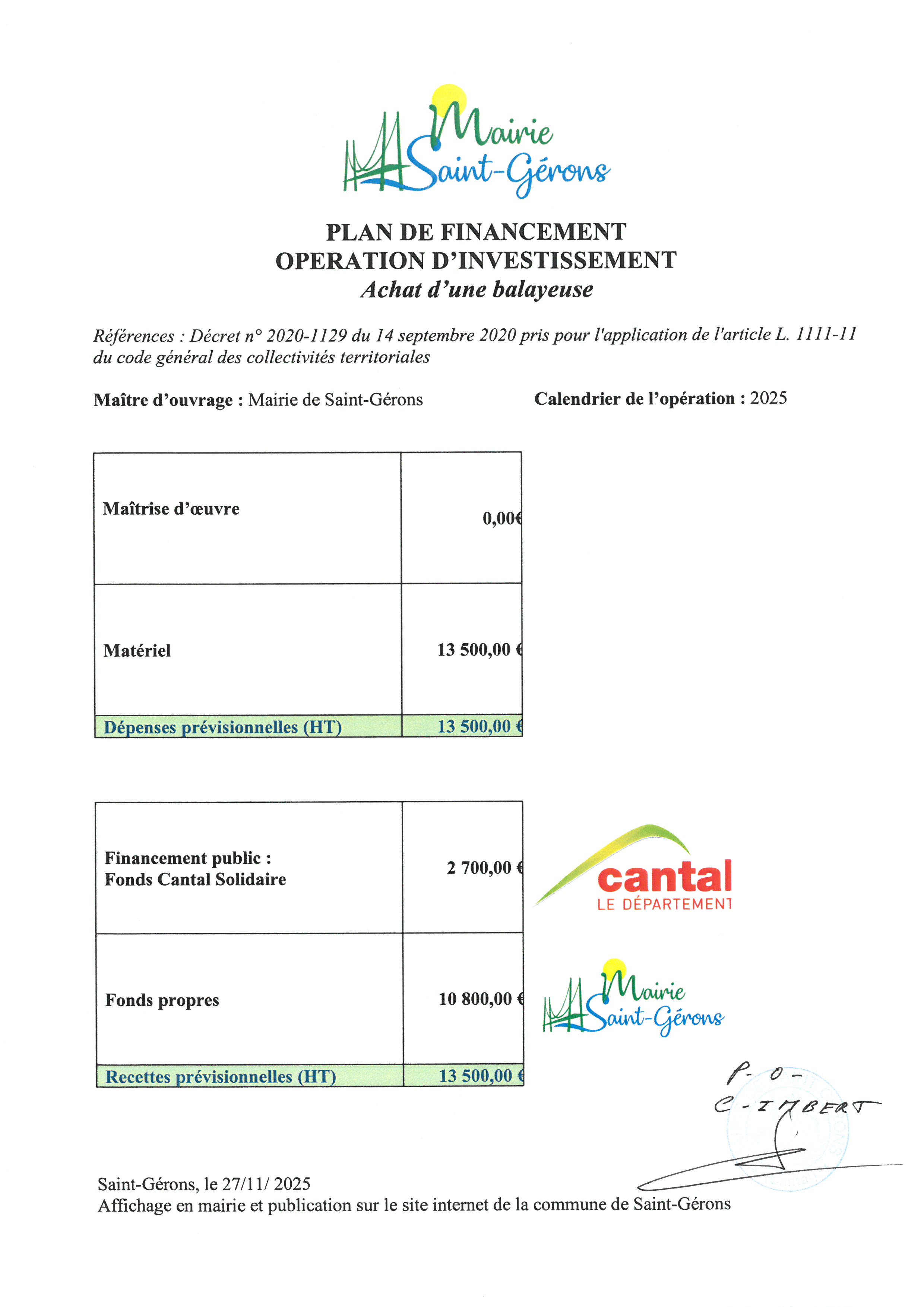 Le plan de financement de l' opération d'investissement de la commune concernant l'achat d'une balayeuse.
