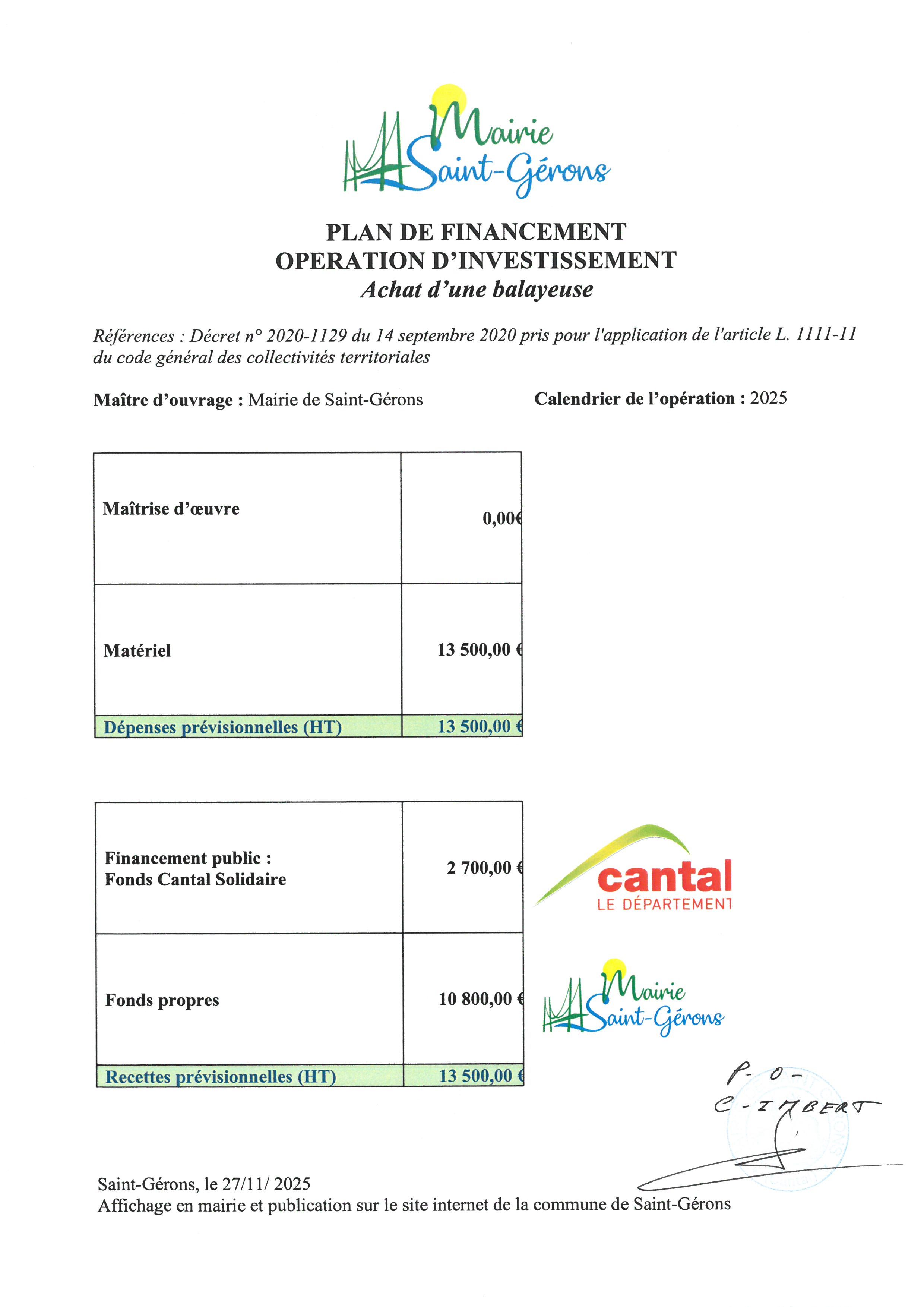 Le plan de financement de l' opération d'investissement de la commune concernant l'achat d'une balayeuse.