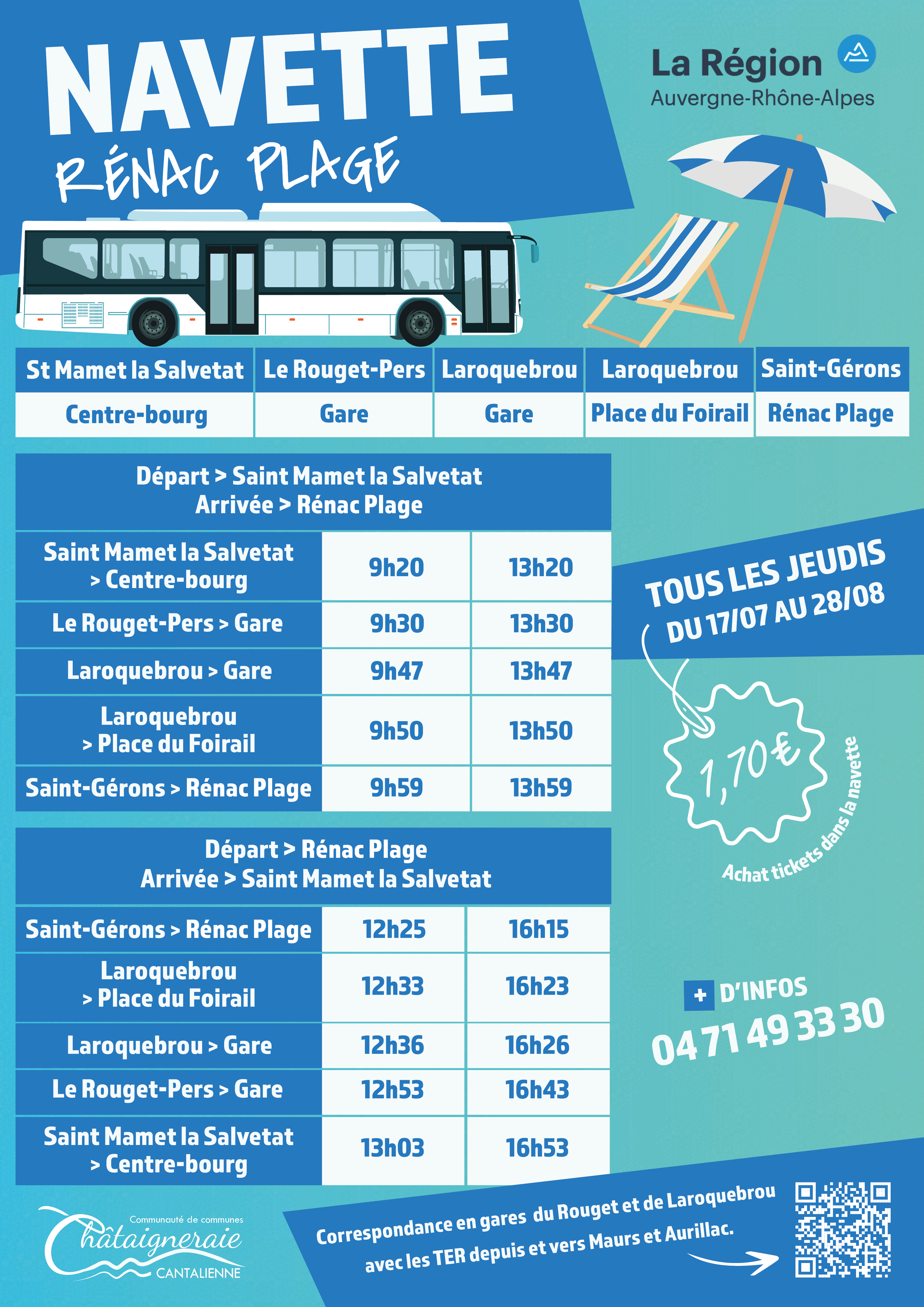 La Communauté de communes de la Châtaigneraie cantalienne et la Région AuRA ont mis en place une navette estivale desservant Rénac Plage depuis St-Mamet tous les jeudis du 17/07 au 28/08/25.